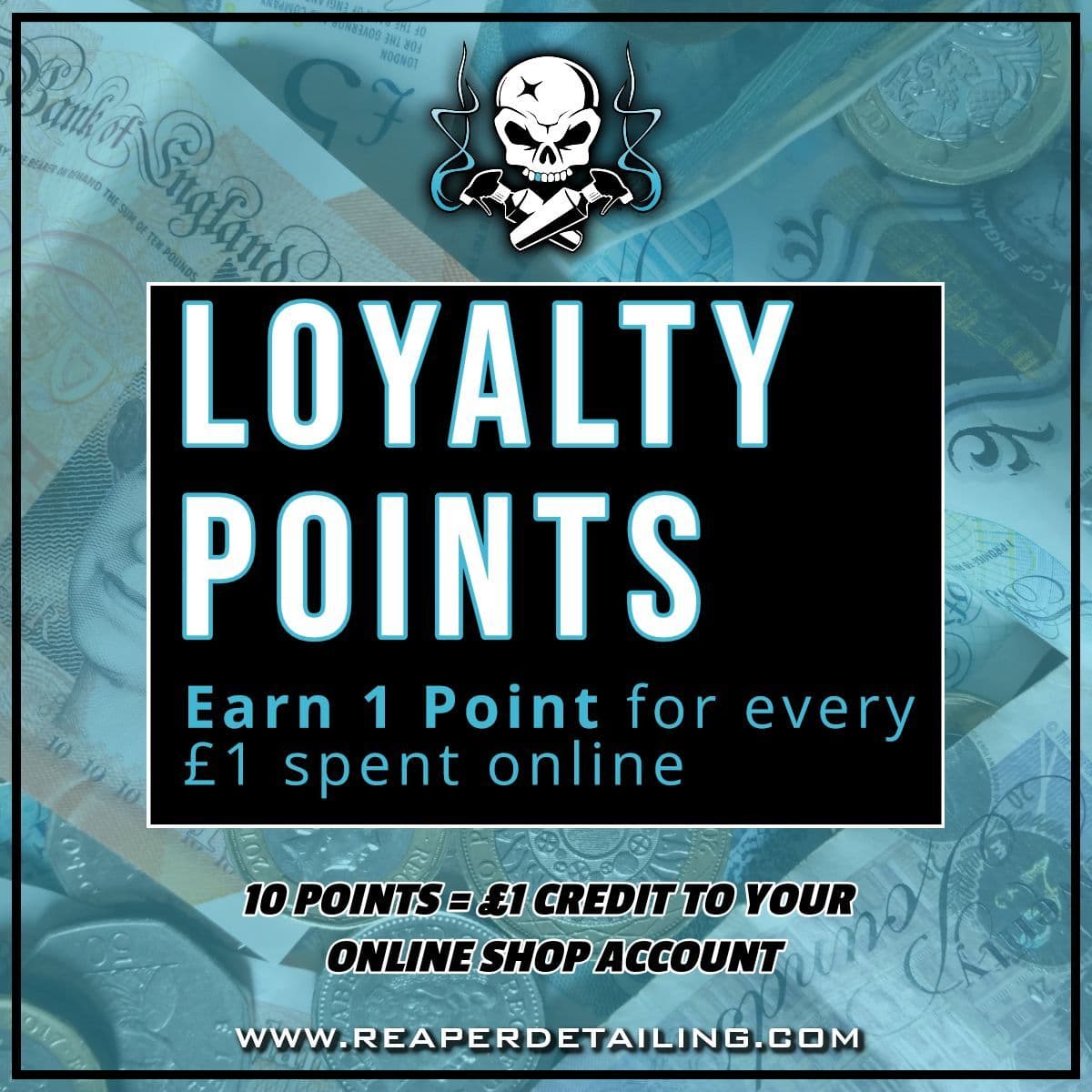 Loyalty points have no cash value, and can only be used towards online purchases through the Reaper Detailing website. Loyalty points are not redeemable for cash or other services.